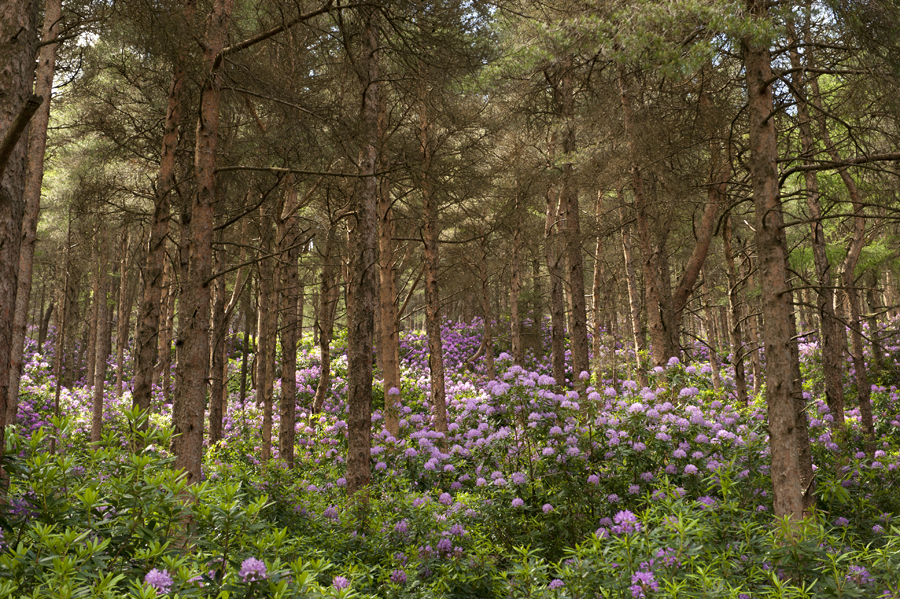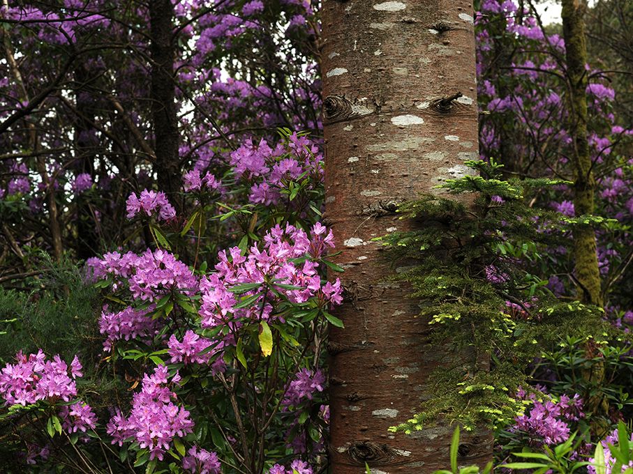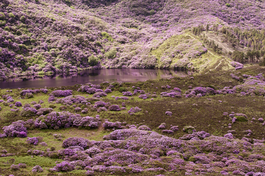 The blossoms are of the color of frothy foam on the top of boiling raspberry jam. I imagine a gigantic cauldron in the hills above the Bay Lough, and the jam overflowing the cauldron and making its way down through the woods, dripping from the rocks and making puddles in the hollows. A waterfall of pink. I am overwhelmed by this breathtaking beauty.