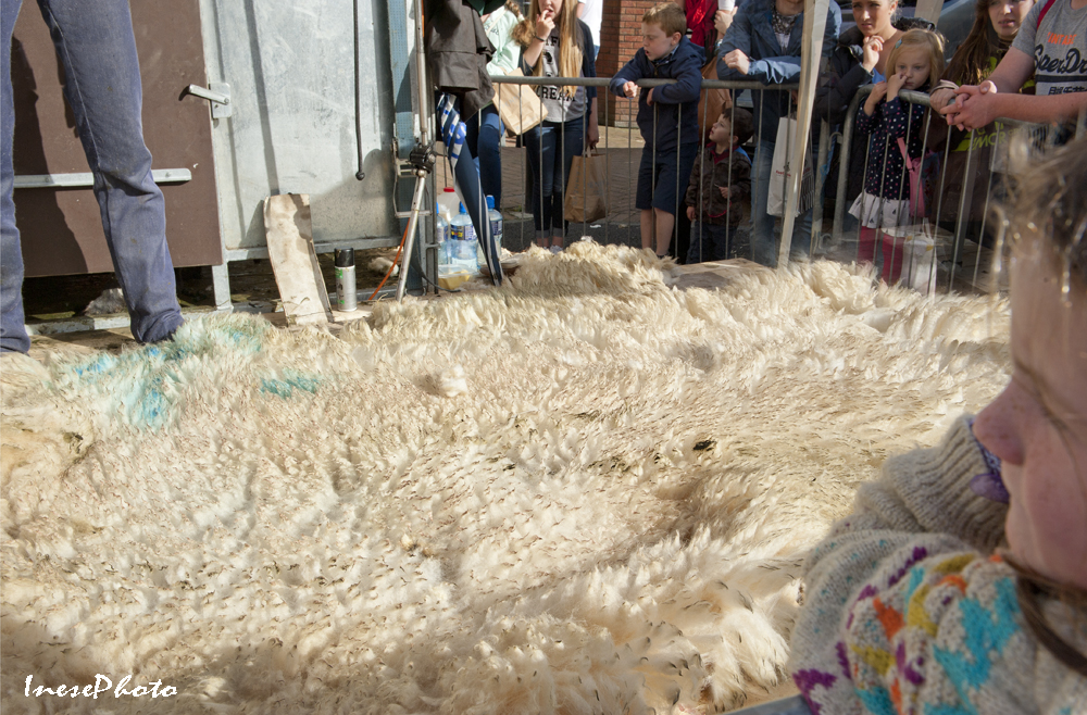 The entire fleece is removed, and thrown clean side down in a matter of a few minutes. No sheep were harmed in the process.