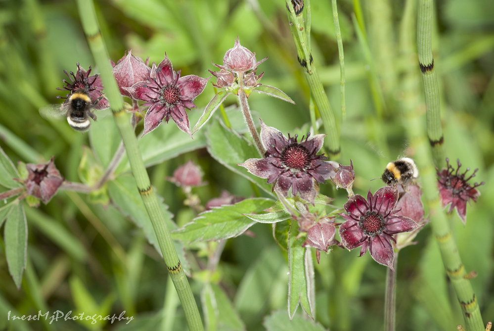 Marsh Cinquefoil’s red petals are not petals at all. They are sepals. The petals are dark and tiny. A cloud of tiny bumblebees are working the flowers. I change my settings to manual and patiently wait for the opportunities.