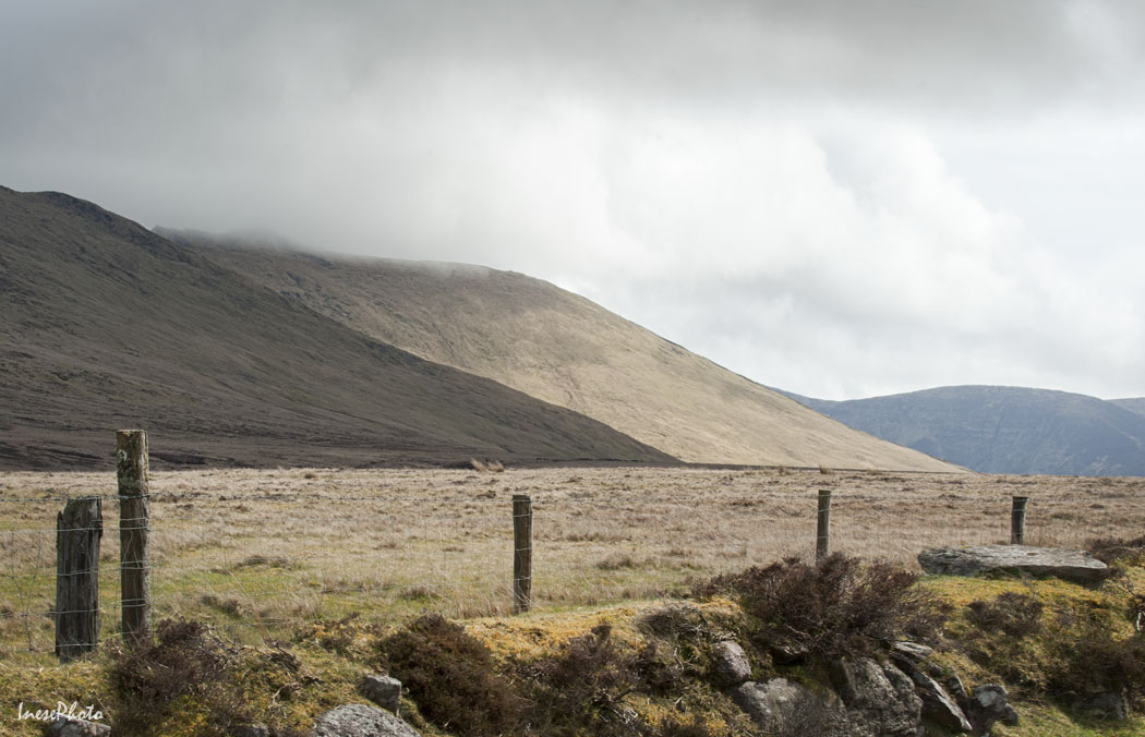 The Comeraghs are formed by twelve mountains and various hills. They are located between Clonmel, Ballymacarbry, Dungarvan and Rathgormack. The highest point is at 792m ( 2,598 ft). In the photograph below you see the foothills of the Comeraghs from Clonmel side of the mountains. The upper part of the hills is wrapped in a tick cloud.