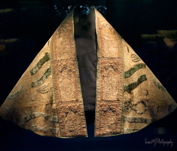 The other is the set of 15th century Benediction copes and High Mass vestments. They are made from Italian silk woven in Florence. Depicted on the embroidered panels are scenes from the Bible. The set consists of three copes, two dalmatics and a chasuble.