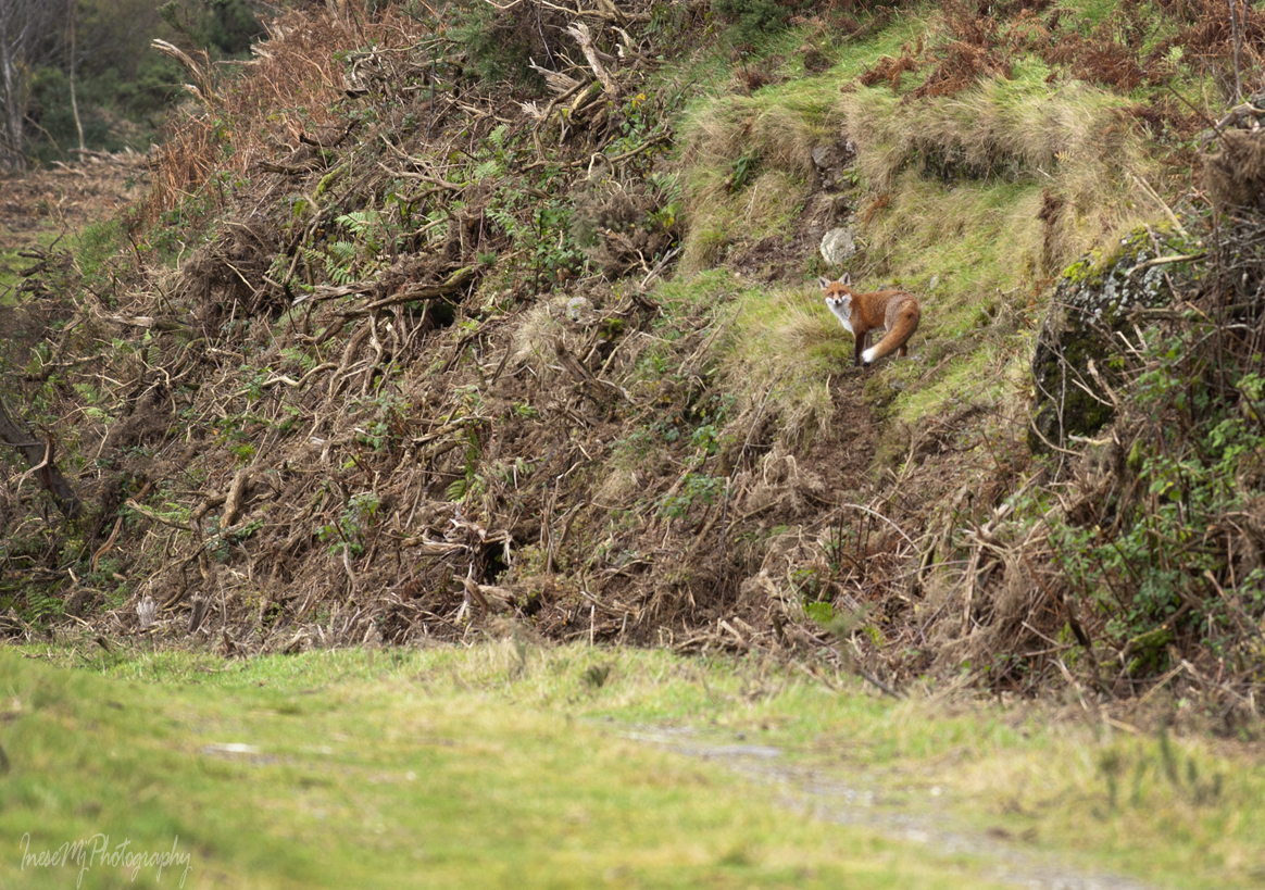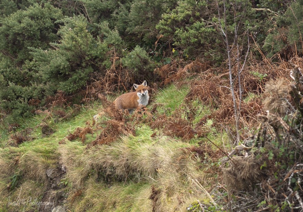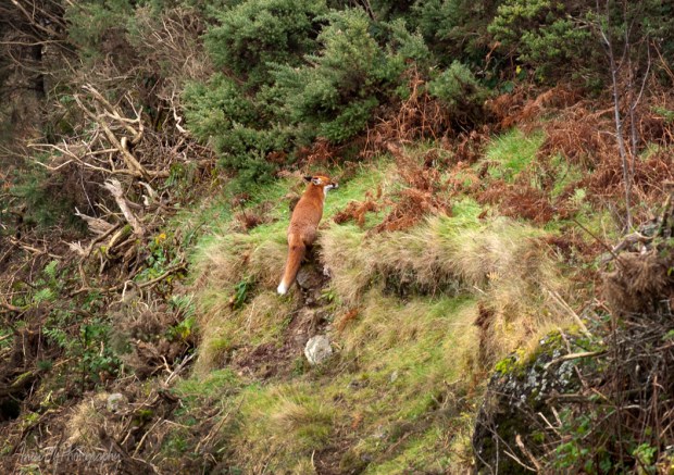 When I say ‘we will walk a road’, I mean we will walk about a mile of a steep grassy path with the mountain slope on our left and a breathtaking bird-eye view on our right. We can expect to see some wildlife too. One day a fox stuck his head out of a gorse bush right in front of me. We had an eye contact and after a minute he slowly retired back into the bush. I kept walking for another while until I had to stop and take a breath. It is when I realised that the fox had been following me all the way up. I slowly moved towards him to take pictures.