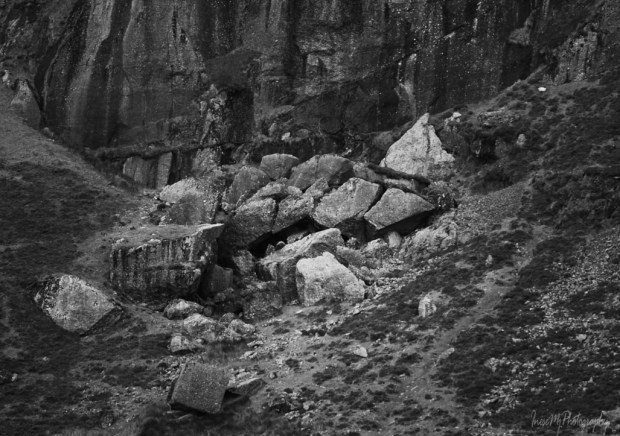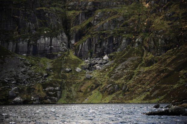 Robins and rabbits distracted me. It was after 3PM when I finally got to the lake. There I met another hiker, Garreth, and we exchanged some bits of information about the area. When Garreth left, I had the whole coum to myself. It was quite dark, I took a few pictures of a shallow stream and walked towards the far end of the lake. It is a half of a mile long walk, and I wouldn’t go to the caves anyway, so I just took this picture from a distance. To get a sense of scale, look at the white dots – the sheep. The Crotty’s cavern is in the centre. On the right side of the cavern the rockfall created a series of caves where Lackendarra would stay in summer.