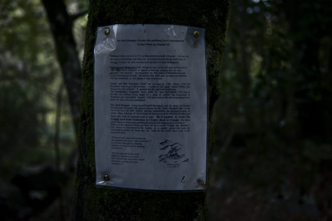 Crough [crew] Wood is a strip of wooded area on both sides of the River Mahon cascading down the lower slopes of the Comeragh Mountains on its way to the Ocean. It is a tranquil place with a slightly haunted atmosphere. The walking path is comfortable, wide and smooth. For the more adventurous walkers ( and photographers) there is a wilder version of the path lower on the river bank. It is from where all the water pictures for this blog were taken.