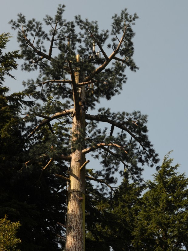 Finally we reach the place where the communications mast disguised as a tree used to be. In this picture, you can see the satellite antennas on the fake tree. The tree was a familiar landmark and I feel sad that it is gone and the new mast is just a mast…