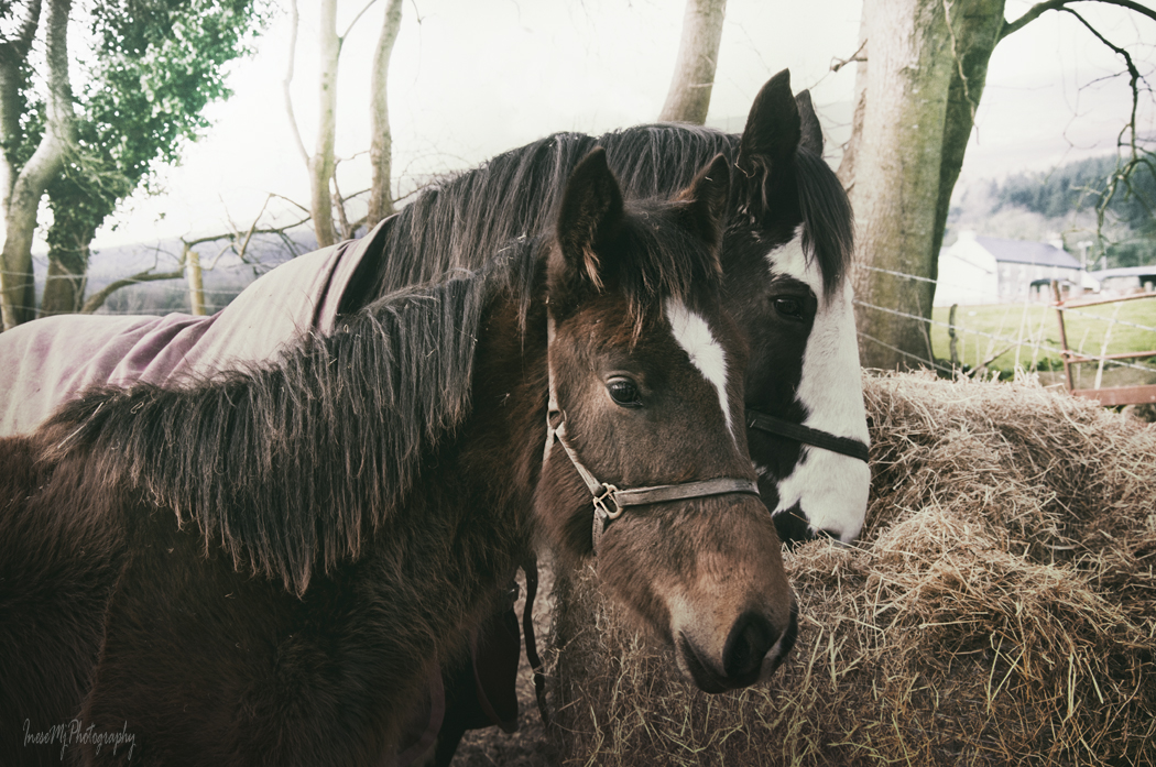 These two snack on hay in the paddock at the foot of Slievenamon mountain in December.