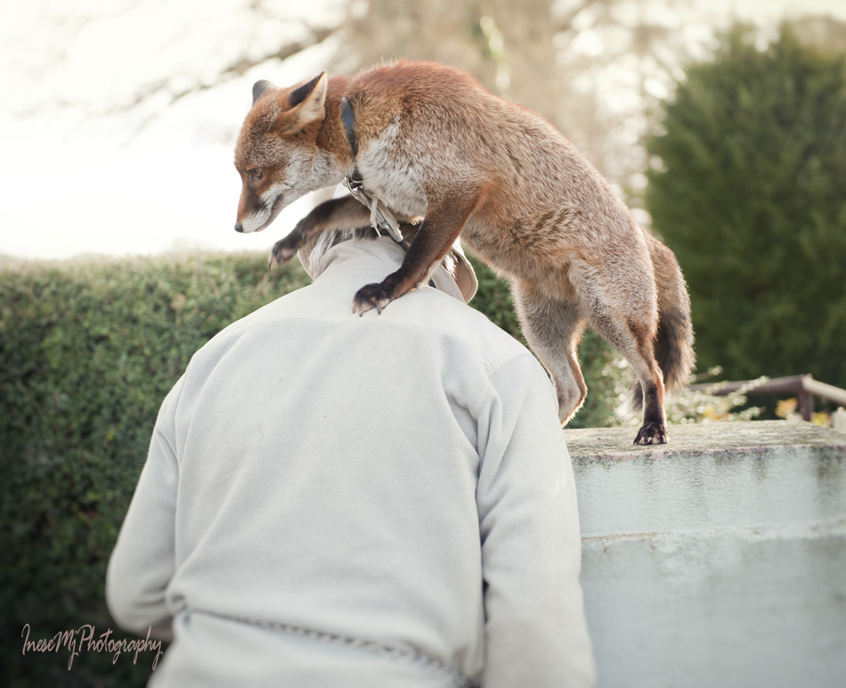 This is Gráinne. She is an easy going, clever and curious lady, devoted to her master. Back in 2007 Pat’s brother-in-law Eugene was working in a storeroom and getting the cardboard boxes ready for shredding.  To his surprise he found a fox cub inside a box, malnourished, almost dead: it could be there some 10 days without food or water. Eugene brought the cub to Pat who had helped the troubled creatures before. It is how the story started. Pat consulted with a local vet, and the cub was estimated as a 5-7 weeks old, and weighed 1 pound. It was not easy to nurse the little miracle back to life and health, but they did it! The cub got a lovely name: Gráinne.