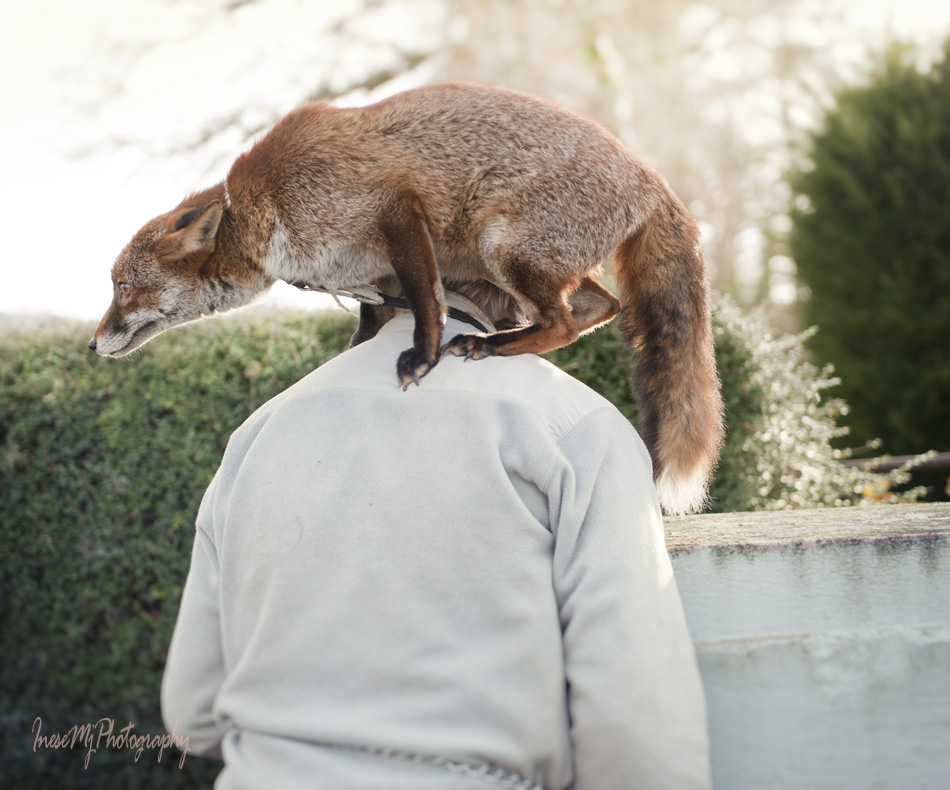 Average life span of a wild fox is 2-3 years although a fox can live 10 years. Gráinne is in her senior age, but you would never guess it. She looks very healthy and happy on her rescuer’s shoulders; she has had a long life of mutual love, adventures and little pleasures.  Gráinne run away twice, but was back for dinner the same day. How did she run away? She just snapped the leather leash when at walk. That easy, so if she wanted she could run away any time.