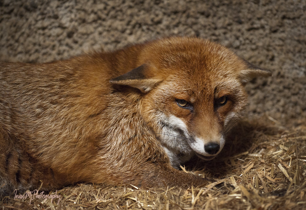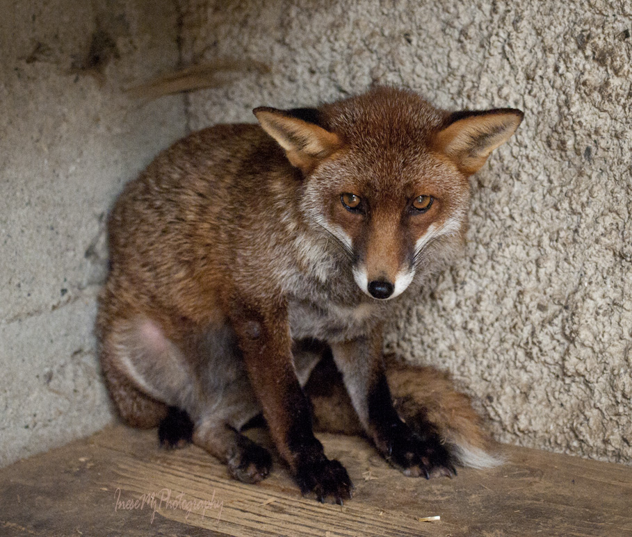 Beautiful Grainne sits in her favorite corner. Each fox has their favorite place in the pen. She is about 12, and has a lot of silver in her fur, but she is still playful, and performs her usual tricks on demand.