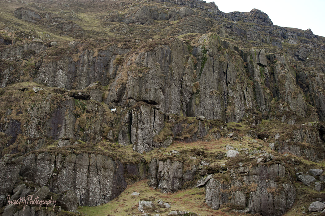 Semi-wild sheep are perched on the edge of the cliff. If you are lucky, you might see a herd of feral goats around the Coumshingaun ridge nearby.