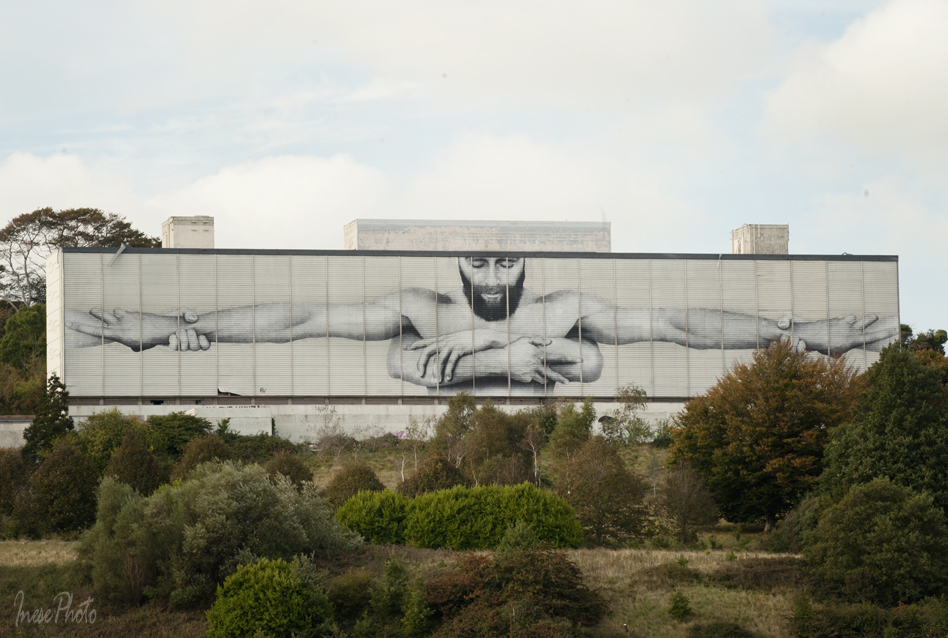 Youri Cansell, aka Mantra (France), is famous for his nature-themed works, but for this festival he painted an image of street artist. What a thoughtful gift! I hope it has a long life – it is already loved here. You see a gentleman in my picture enjoy mimicking the painted artist. The work is sponsored by Ambassador of France in Ireland.