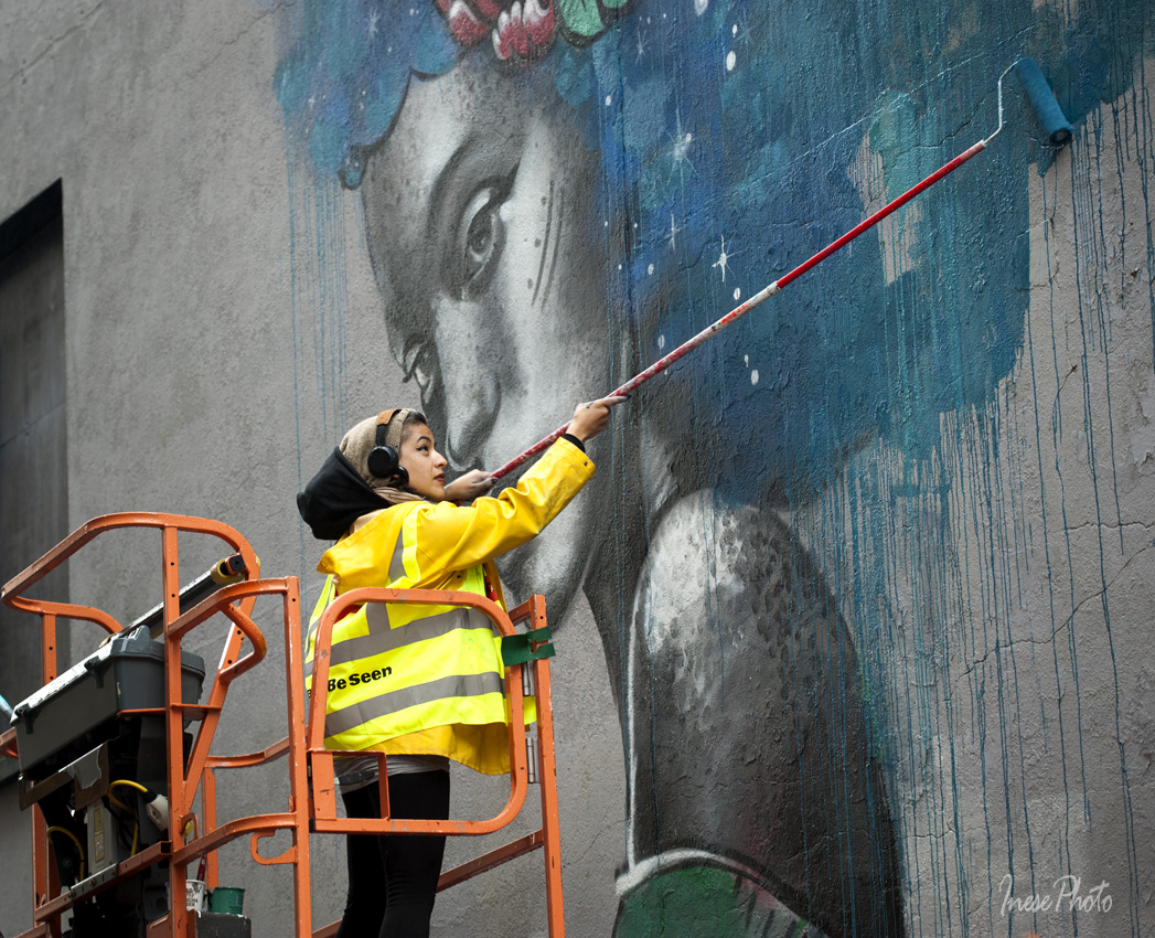 Several mural artists share Stephen street, it is why I like to come here. Toronto/Dubai based artist Fathima Mohiuddin, aka Fats Patrol, is working next to Kevin.