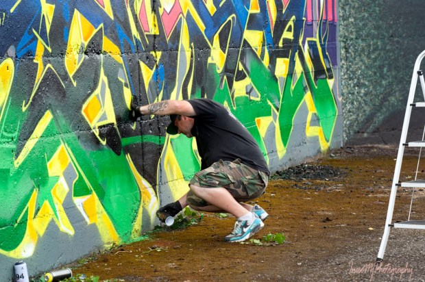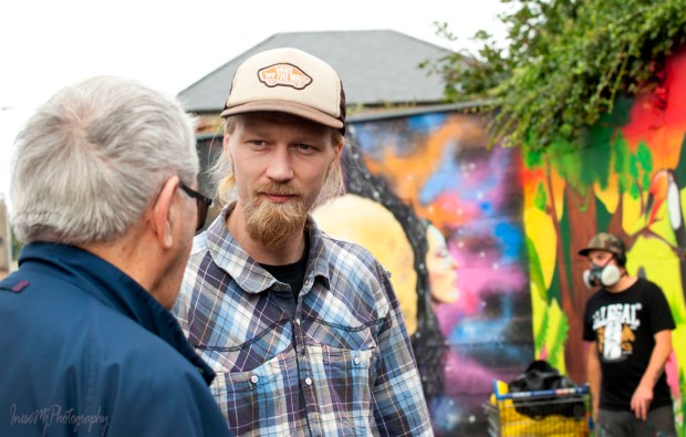 While I was hanging around taking pictures, Bo was working away and minding his own business. A disputatious elderly man approached him and started to challenge his knowledge of art and purpose of graffiti. When (quite arrogantly) asked about his education, Bo replied that he actually has a degree in Arts. The man was stunned. “Then you are more educated than I” he exclaimed in disbelief, and left visibly deflated. Graffiti rocks 🙂