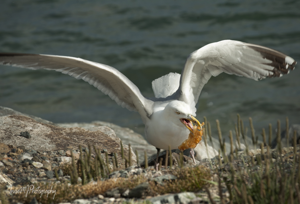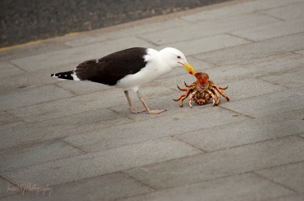 Seabirds here are foraging around the fishing vessels and chippers. See who is lucky today? This Great black backed gull got a crab, and the Herring gull – a chunk of battered fish.