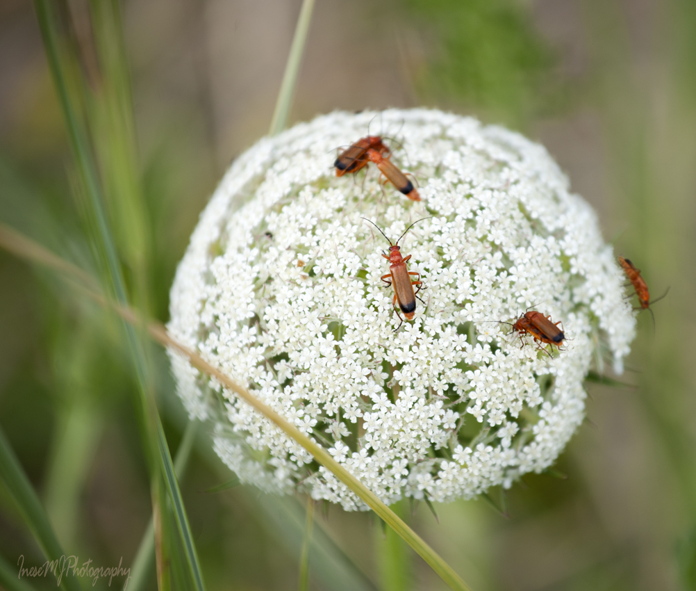 Sea carrot is hosting a wild Red soldier beetle party.