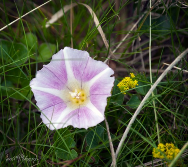 Sea bindweed is different from the familiar Field bindweed – the leaves are small and fleshy, and the trumpet is vivid pink. They call it The Prince’s flower.