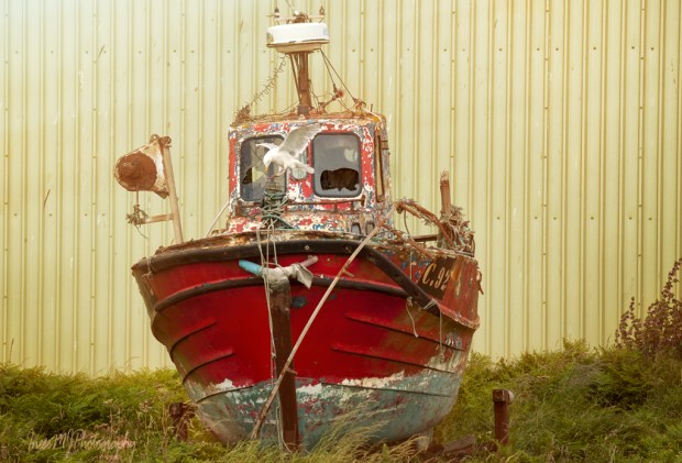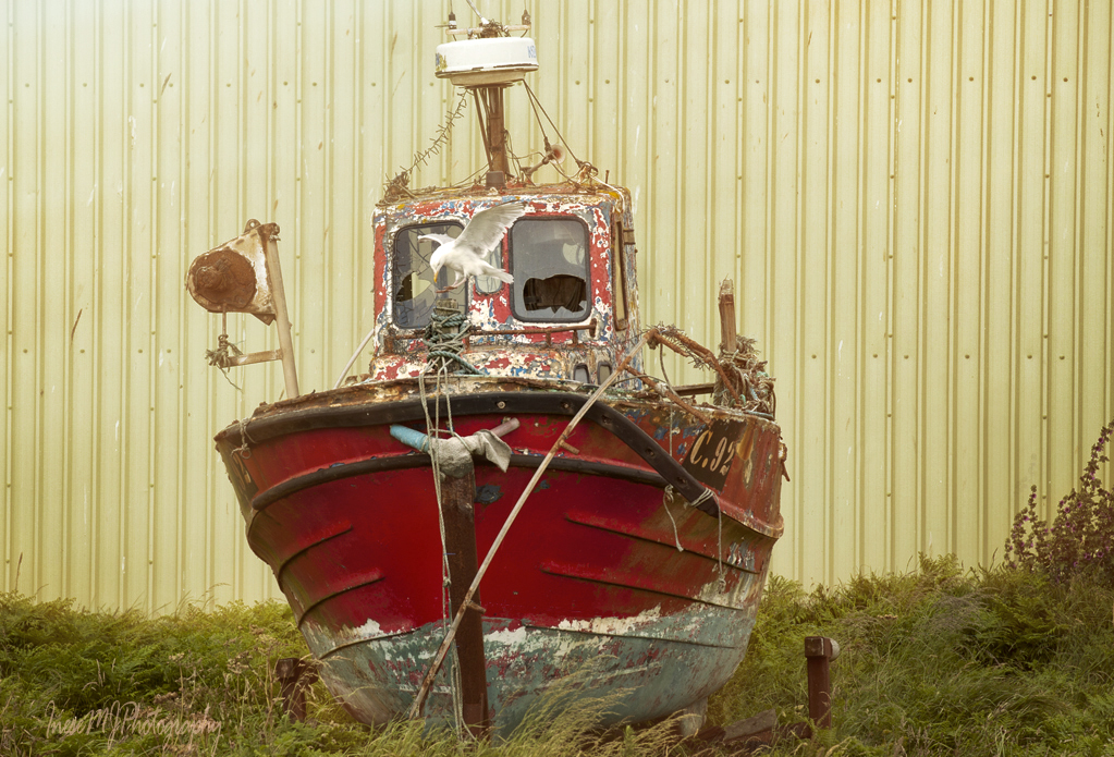 A herring gull landed on the old boat.