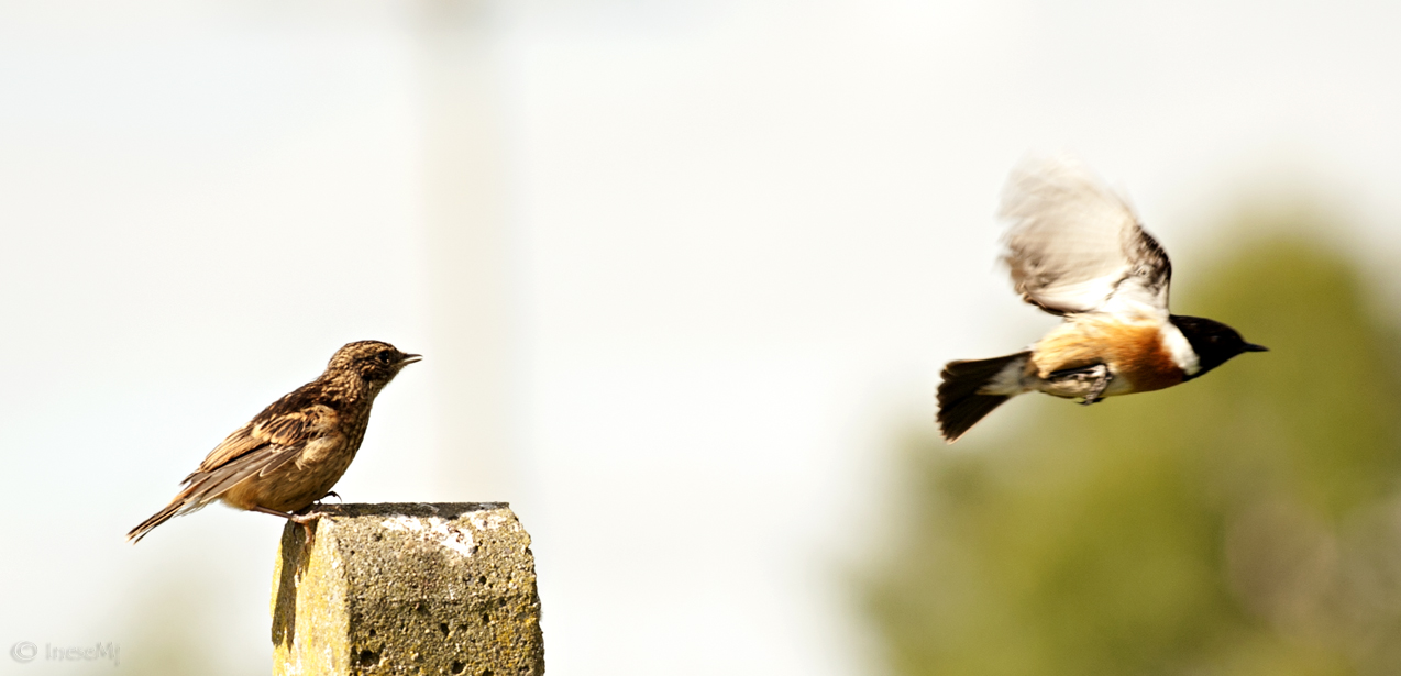 The bird looked like a young female, and later I learned it was a European stonechat. It was flipping from one pole to another, and finally settled so I could take these pictures. After about a minute of chirping there came a male stonechat.