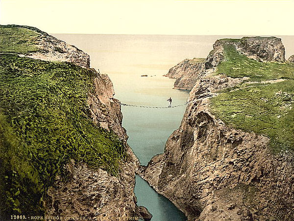 The rope bridge didn’t always look the way it looks now. Built by salmon fishers in 1600s it was used from June to September as an access to the rocky islands. The fishers ran their nets between the islands to catch the salmons coming through the area to spawn in the nearby rivers. Below is an image taken in the 19th century. Up to the 1970s the bridge had only a single handrail.