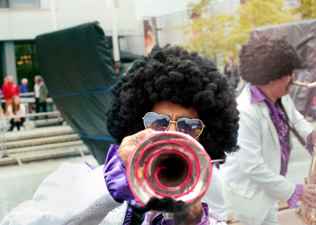 With the Waterford Crystal House in background, The Tamarros marching band from Italy look very appropriate flashing their disco ball baton.