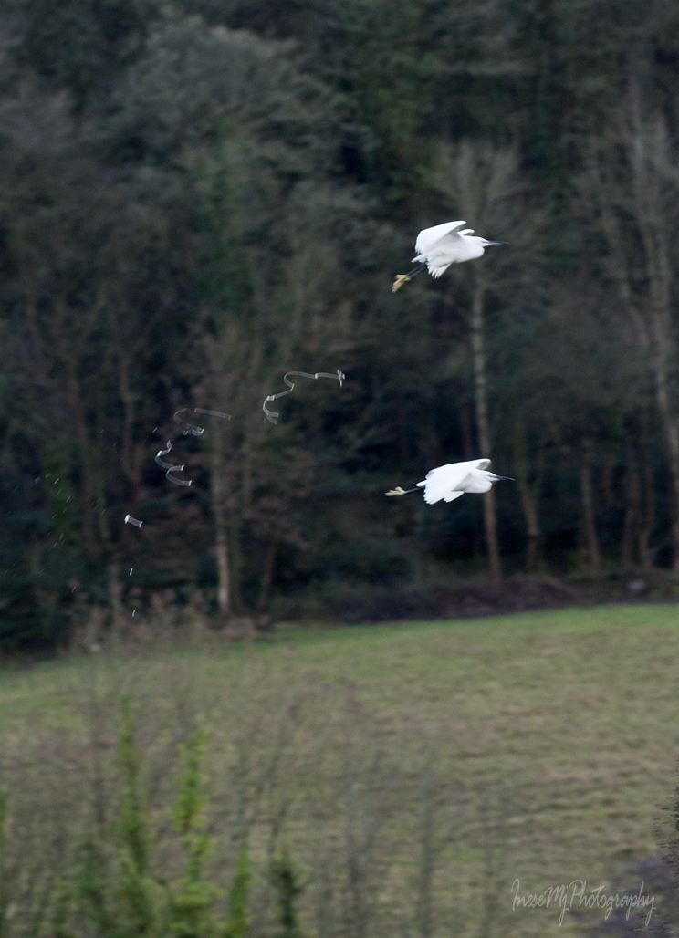 The sun rolled behind the hill. Two egrets call it a day and depart for the trees.