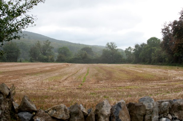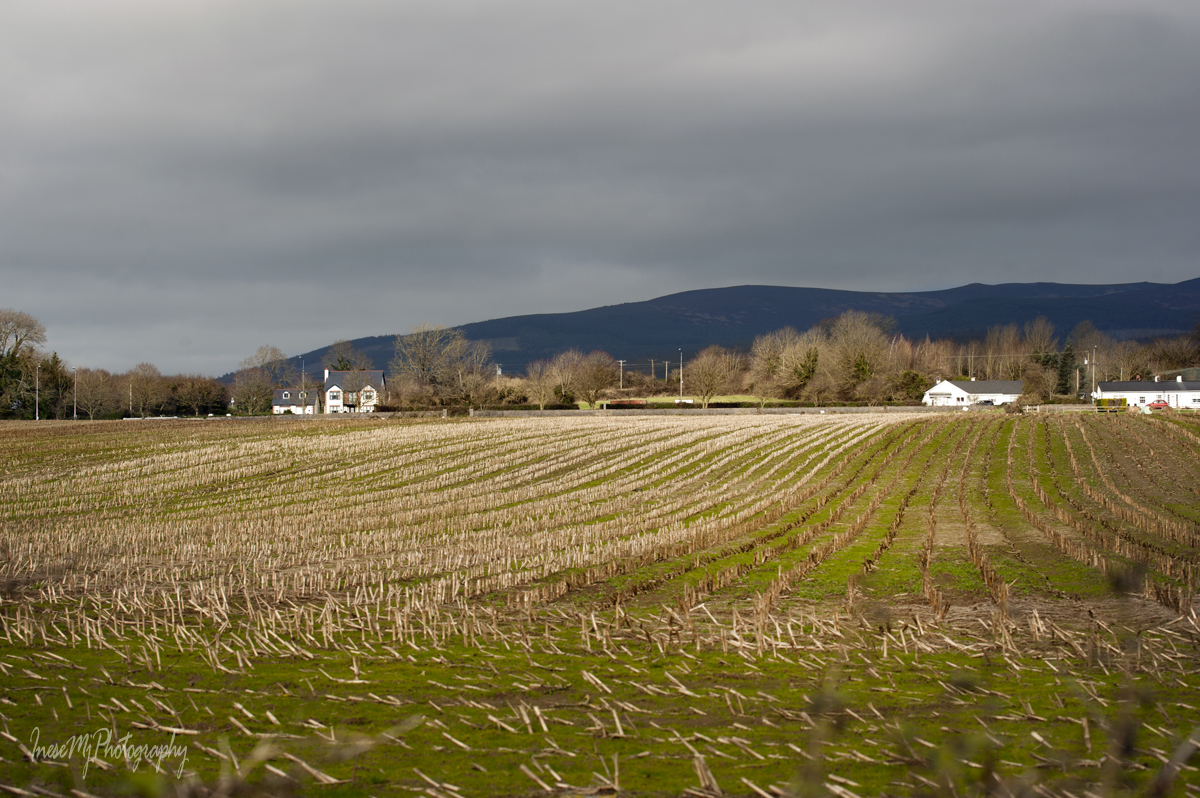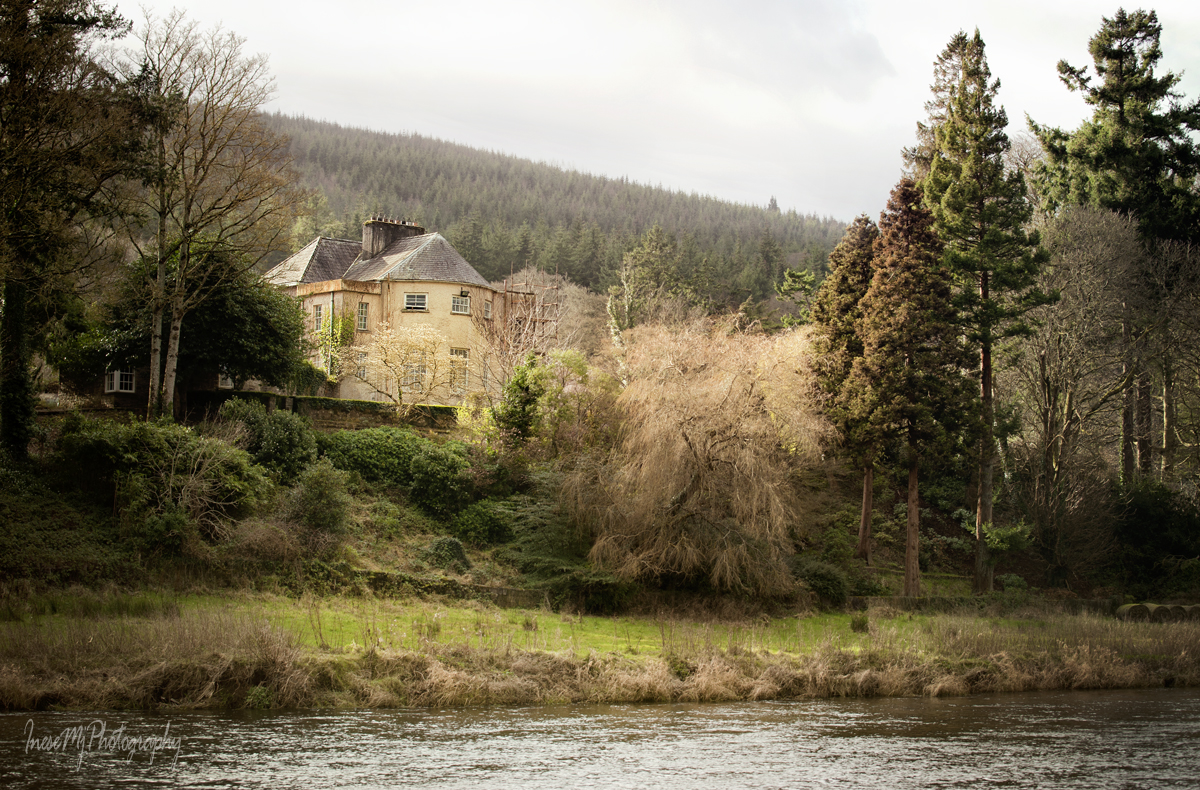 The river makes an S-bend at the tower house. Peaceful fields lay on the north bank and the steep wooded slopes of the Comeragh Mountains rise on the south.