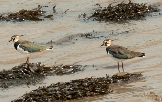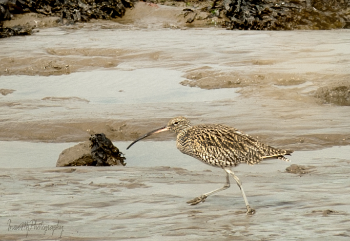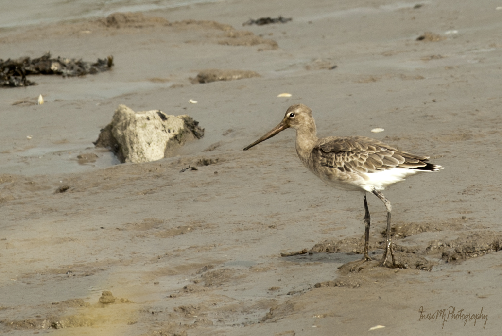A flock of Godwits are picking lugworms at low tide.